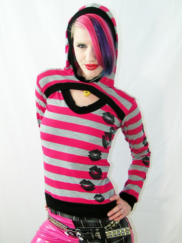 Another super cute option is this pink and gray stripe hoodie with kisses printed all over it, pair it with jeans for day to day wear or a hot denim mini skirt and tights for a super hot streetwise look.