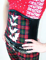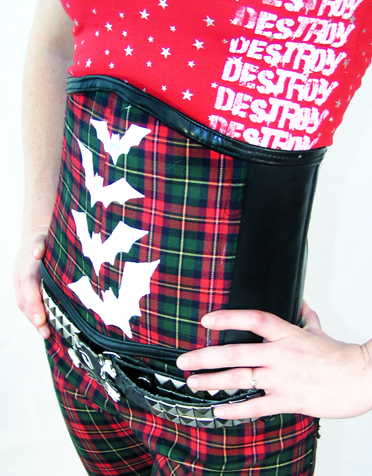 leatherette under bust corset has the tartan for punk style and grommet tape straps on the front for attitude.
