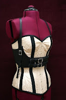 Im starting off with a corset that is a tribute to the steamy 20's film nuar scene, this black and white satin stripe and vinyl corset is to die for, I added 2 corset ties on the bust cups to accentuate the busty line. This one is a classic!