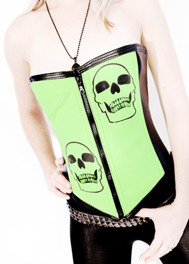 Another favorite is this green leatherette and vinyl skull patch corset, I