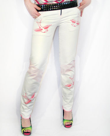 added texture again with pink stitching on the knees front and back. I also screen printed swallows all over the pants to give them that wild child 50's feel.
