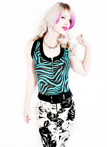 Im loving this turquoise zebra & glitter fishnet racer top! I added a zipper on the front for a sexy rocker touch, so this top is definitely the one you would want to go out on the town with!