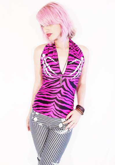 pink zebra and skeleton hands print halter top, a fun nod to 50's glamour pinup style with a cute modern twist. skin tight fit thanks to a super cool zipper closure on the back. super sexy and fun!