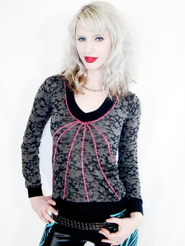 A great top for these spring days is this burnout splatter neon pink spider stitch long sleeve V neck top, its super lightweight and so its never too much for these weather changing days, and it looks super hot with these sexy turquoise zebra and black spandex tights.