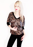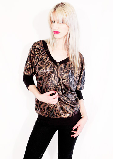 Im totally in love with this metallic bronze flower print V neck bat sleeve top. complete with a pyramid stud on the front, this top is just as cool as you can get, the slouch over sized cut gives you an 80's glamour touch in a second.