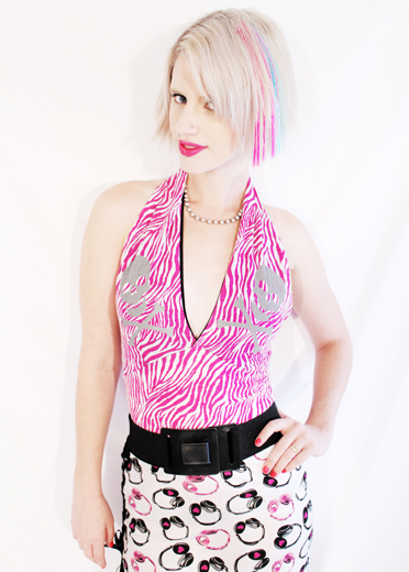 Pink and purple are a match made in heaven and so are these 2 items - A pink zebra 50's pinup girl inspired halter top with skulls printed on the front, paired with a sexy bombshell secretary pencil skirt with some attitude! a corset tie laced through grommet tape on the side for a sexy look and a headphone & heart print pattern on the skirt make this the best ever streetwise set!
