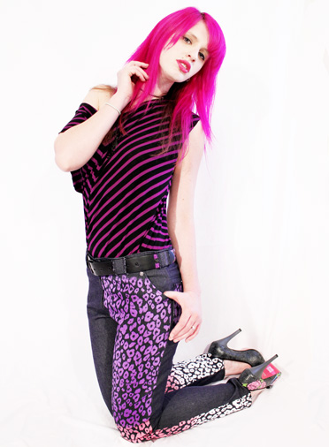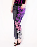 The perfect match with an oversized top is a slinky pair of skinnys, and these jeans are definitely the favorite ones I made to date! I printed on dark blue denim an ombre purple - pink - white leopard print (the mix of multicolor AND leopard is like heaven to me!) and gave them a sexy low rise cut (but not to low, I hate that I cant sit down because my ass is hanging out of my jeans!).