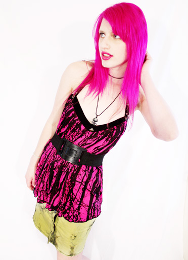 I love the comfort in slouchy tops, and this pleated pink & black woodland halter top is really a fine example of what fun and free means! you can wear it with a waist belt for a fitted look or just as is with a pair of sexy jeans, this top will always scream rocknroll with its grommet tape shoulder straps and pyramid studs on the front.