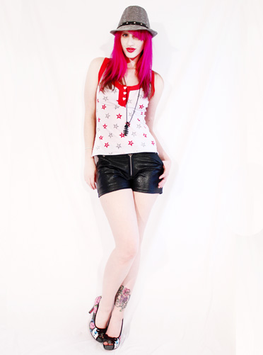 I paired it with these super sexy wet look denim hot pants, these are really to die for, the fabric is so slinky and I added loads of big metallic zippers for that tough girl look.