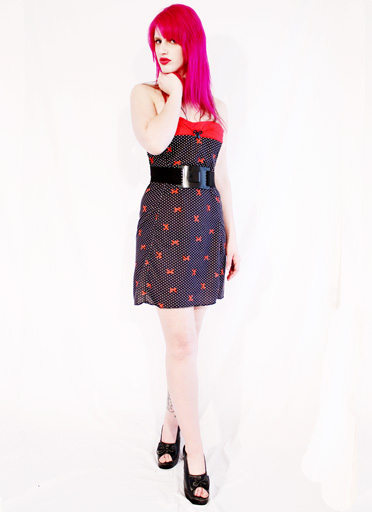 I love this black white & red polka dot & bow print strapless dress. The fabric is light and stretchy for the perfect fit, and the print is so fun and 50's minded, it makes you feel like a modern day pinup! and I just adore that little bow button I found for it, it really ties the look together!