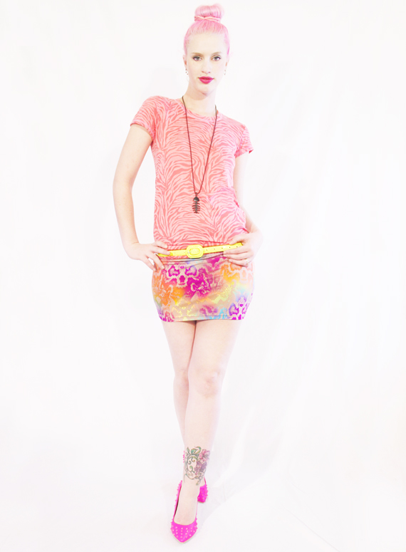 I combined this shirt with another fun piece - this super sexy little rainbow neon snakeskin Spandex mini skirt.
