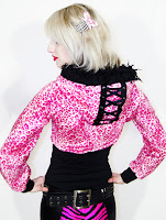 this one is one of my favorite pieces of all time, this corset hoodie pink leopard faux fur shrug is funky, fun and fab! also keeps your face warm with a super soft faux fur lining.
