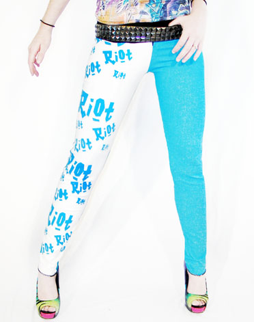 First up is this exquisite graffiti print slouch top ( Im soooo in love with this fabric!), complete with a lace trim on top, a sweet heart button and a satin bow . I paired it with this super flattering baby blue and white riot print skinny pants, full of attitude and made with light fun colors great for summer!