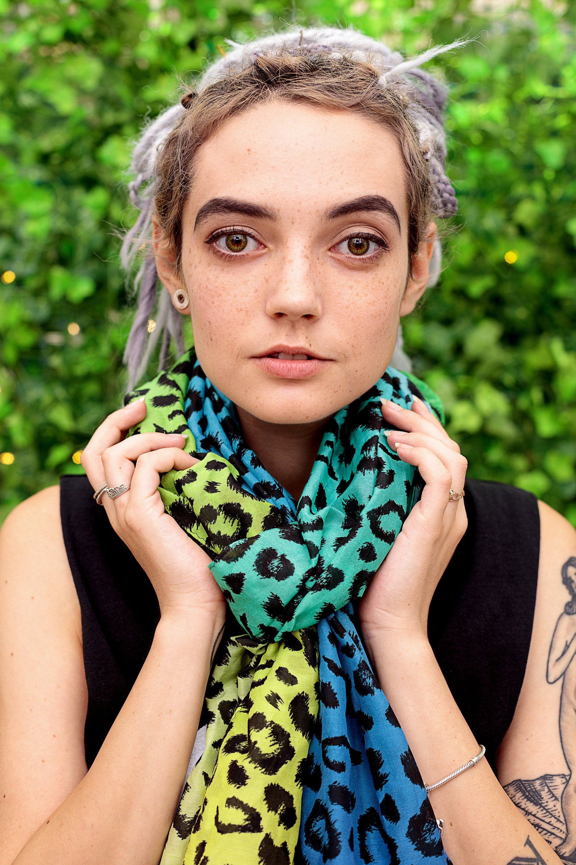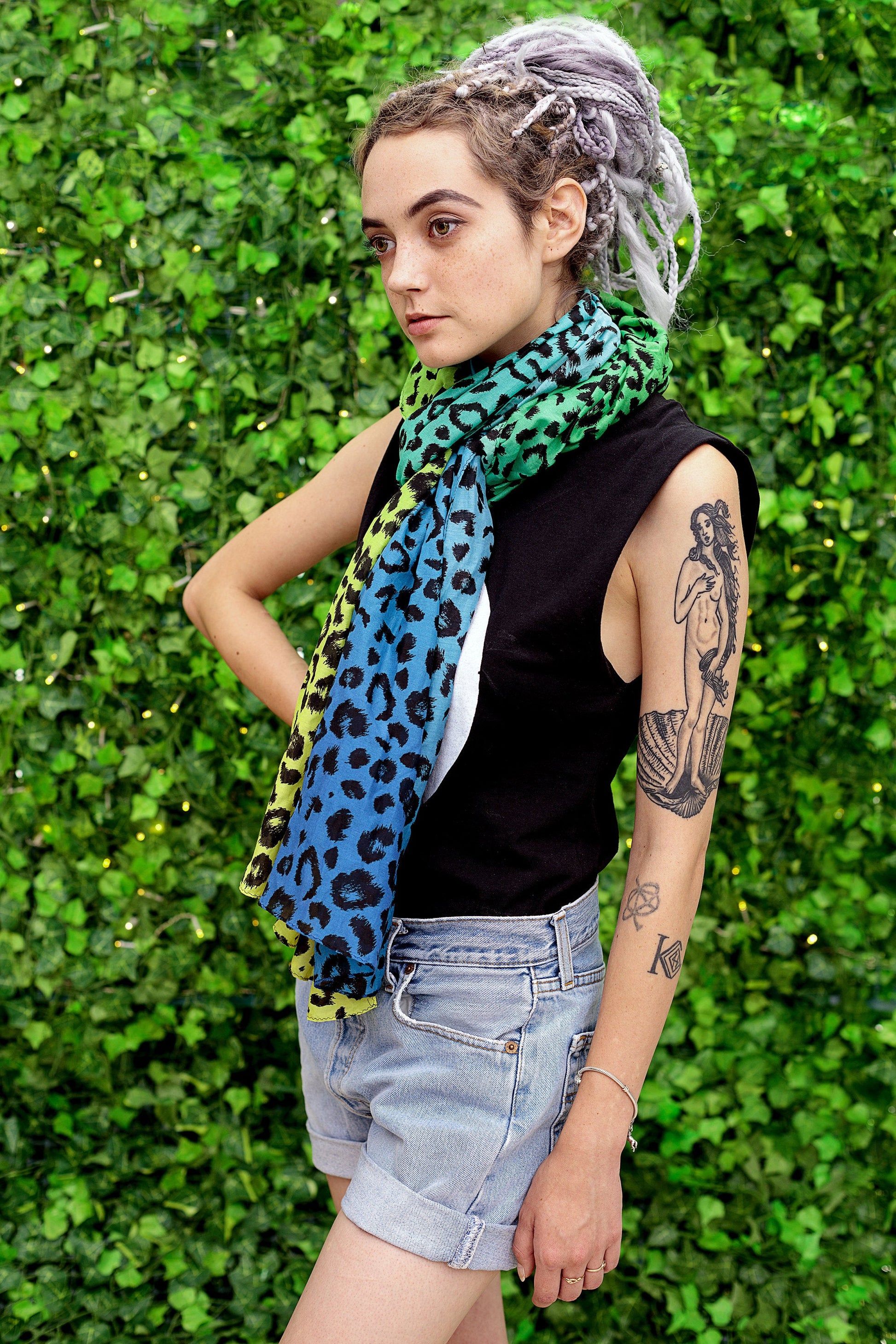 Green blue and yellow gradient leopard print cotton silk blend scarf