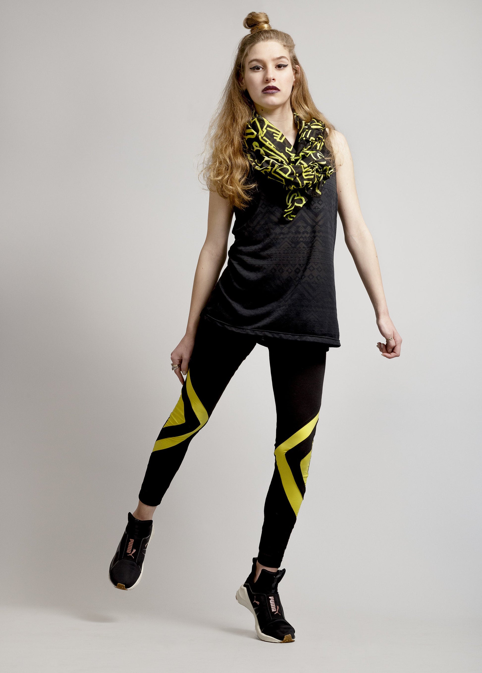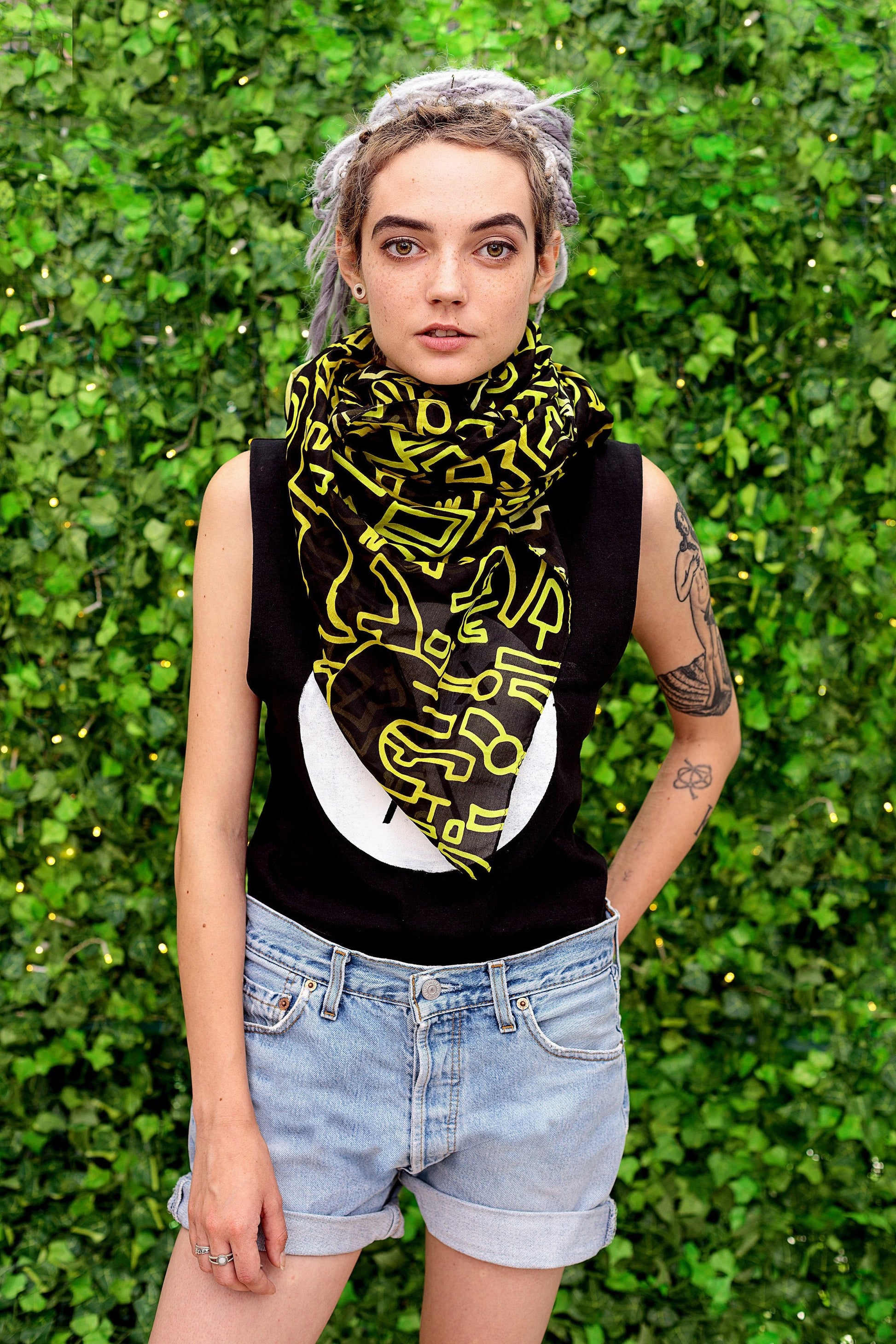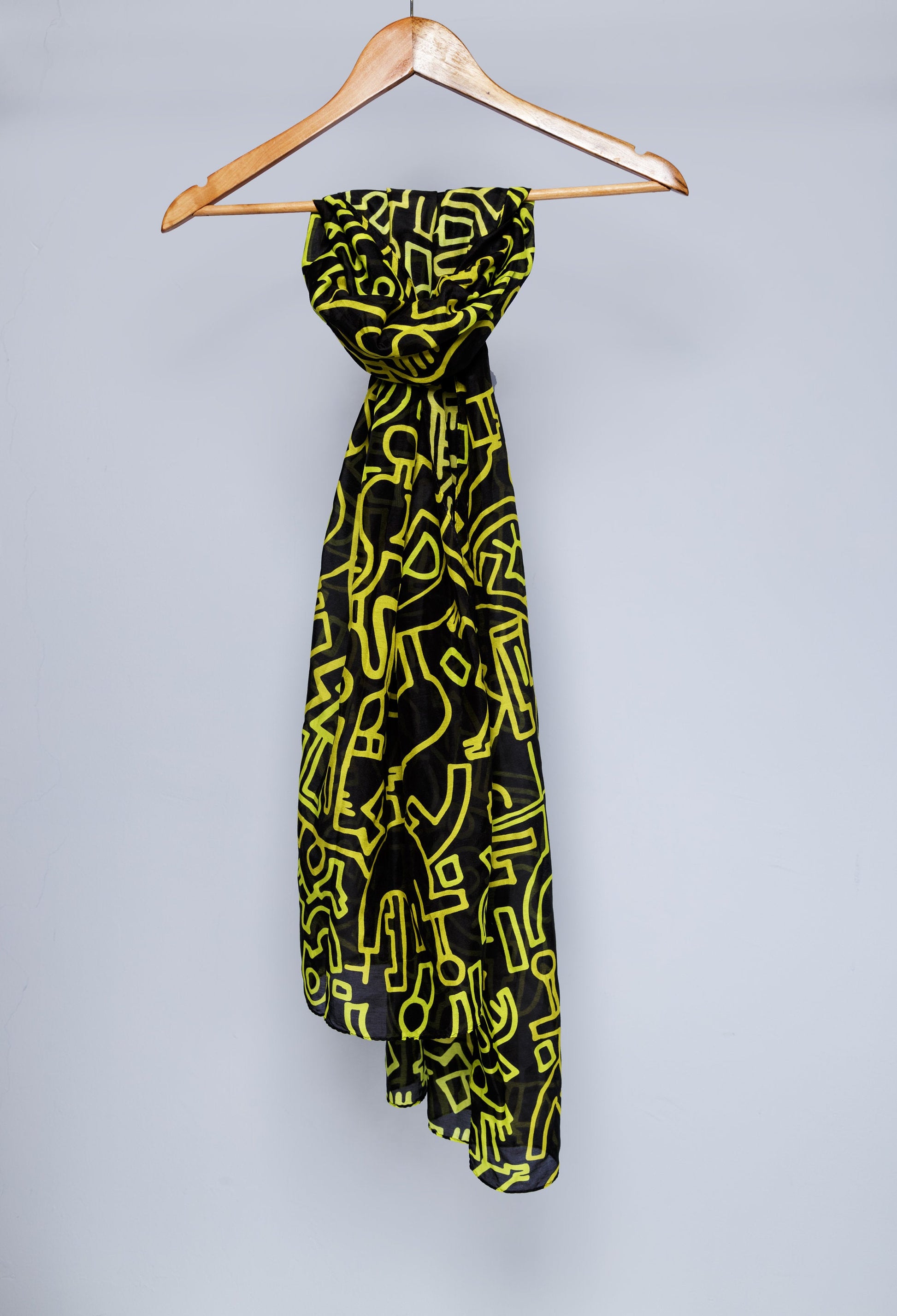 Super luxurious scarf, in a yellow and black tribal scribbles print made for the line by artist Danny Meler.