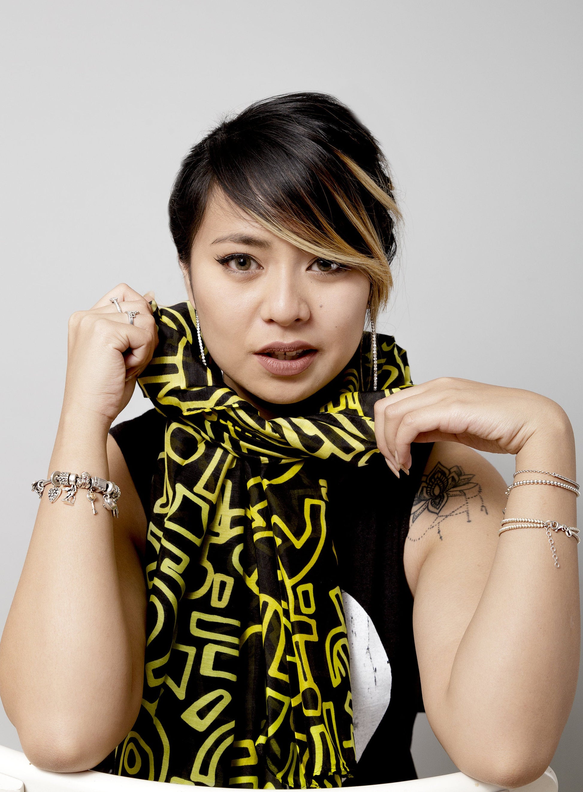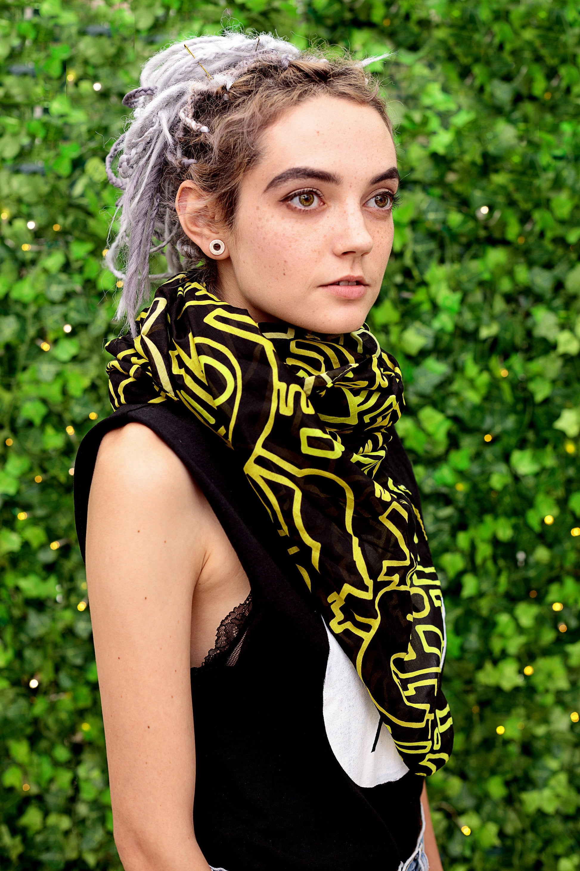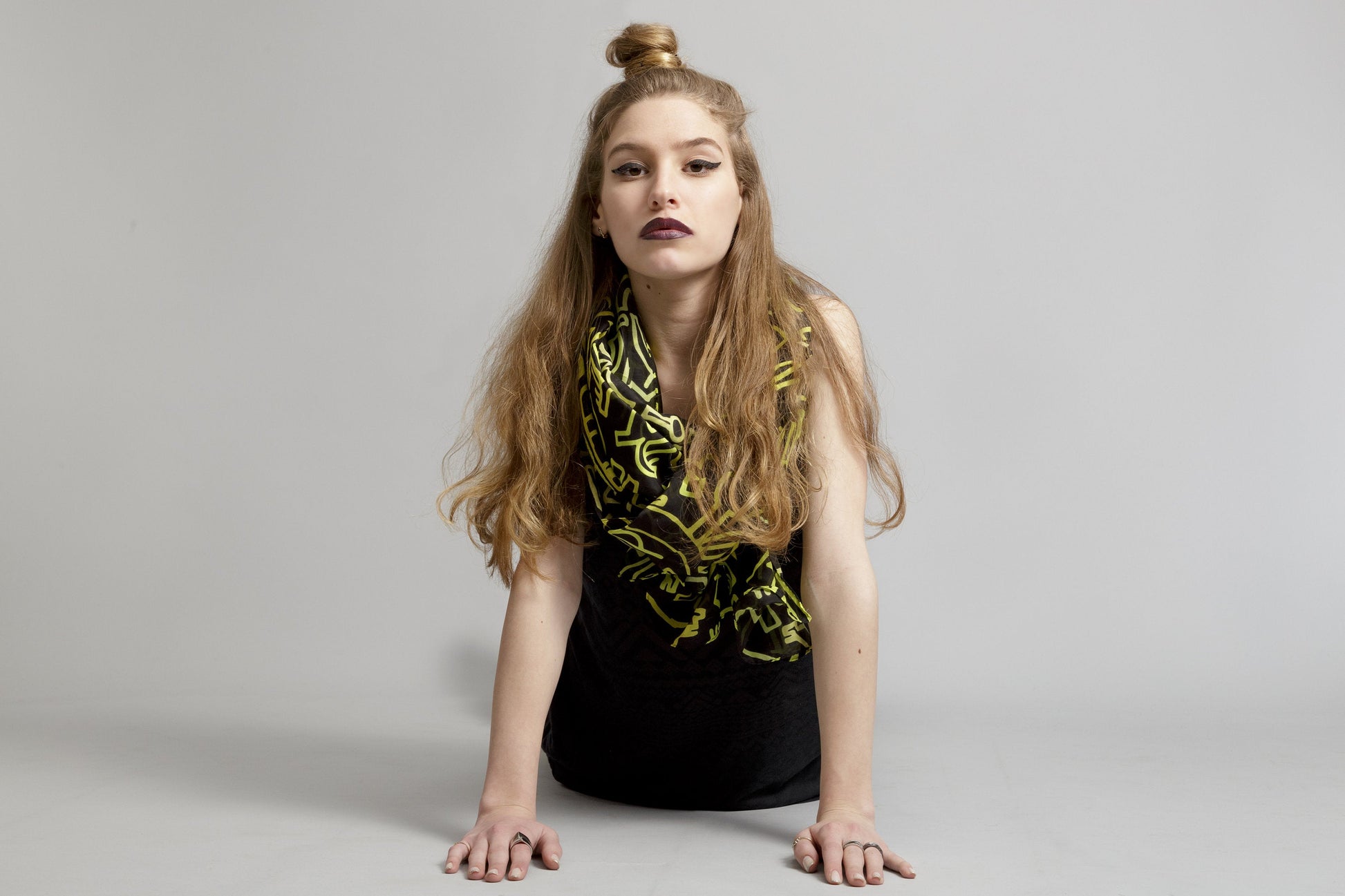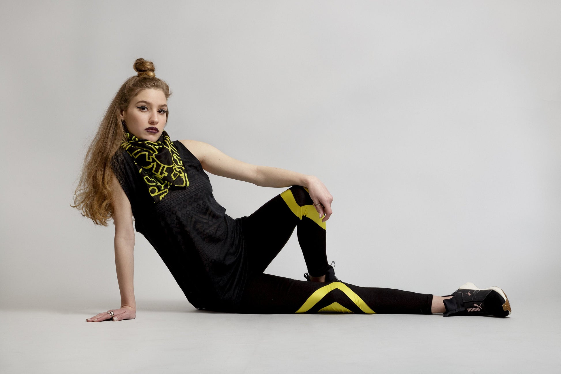 Super luxurious scarf, in a yellow and black tribal scribbles print made for the line by artist Danny Meler.