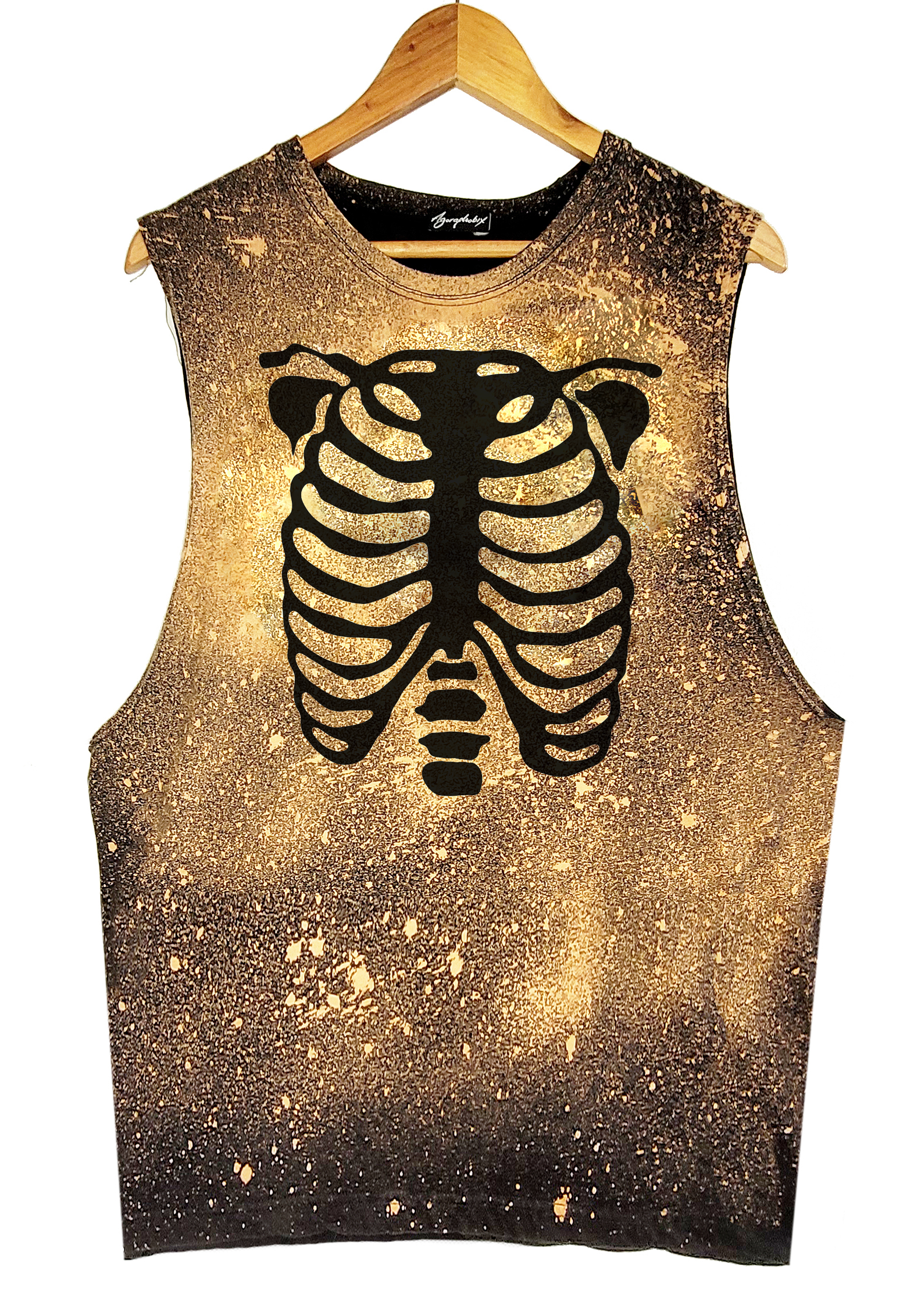 100% super soft cotton t shirt, cut and sewn into a cool flattering muscle tank top, and screen printed with my classic ribcage print . Bleach spray splattered on the front.